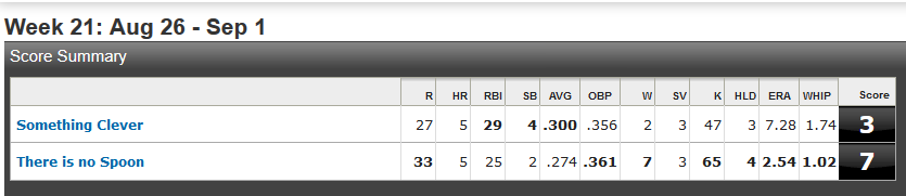 That is what I said last week. I should know better than to taunt. I am not Johnny Football (see, I can do topical humor!). Fortunately, my team stepped up over the weekend or I would have been shutout. Look at how bad those pitching stats were, ugh, this could be cause for concern.
