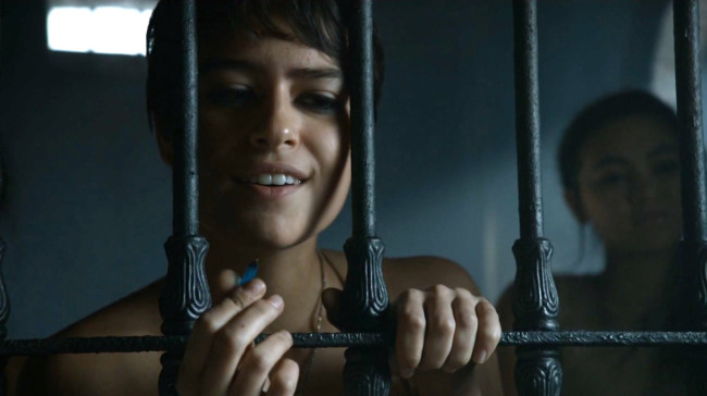 Bronn is stuck in the dungeons and we get to hear his beautiful voice sing the Dornishman’s Wife. The Sand Snakes like his rendition, especially Tyene, who was the one to slash him with her blade. She decides to get naked in order to get Bronn a bit excited. Then she tells him about the poison on the blade. He is about to die and she says she will give him the antidote if he admits she is the most beautiful woman in the world. Really hard to argue with her.