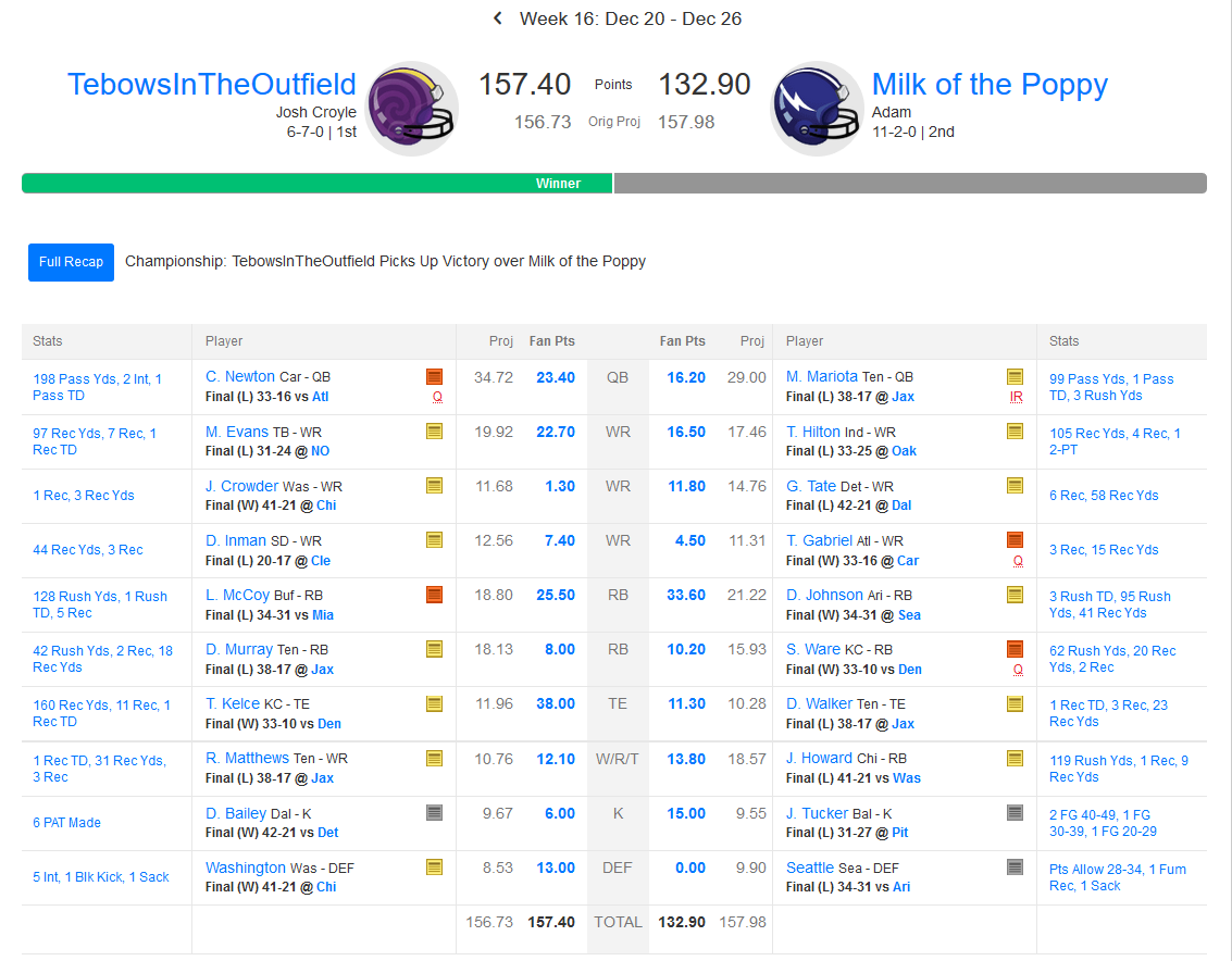 I did it! I finally won a championship in fantasy sports! Okay, I have won before, but this is my first championship in either of my leagues. I will not lie, this was a bit of a nerve-wracking week. My brother was projected to win by a point. I decided to ask friends for advice on which QB to start. The overall consensus was to start Cam Newton. Most people agreed that with the cold weather in Chicago and the Bears decent defense, Cam would be the better option. As Offord put it “drop both QBs and pick up Kaepernick. Screw you.” I guess he was still bitter about losing to me.